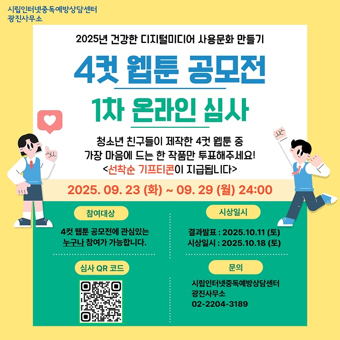 | 2025년 4컷 웹툰 공모전 1차 온라인 심사 안내 (~9/16까지, 선착순 기프티콘 지급) | |||